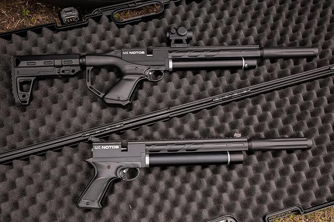 - Quiet shooting side lever cocking Notos Carbine is easy to shoot and allows the shooter to smoothly transition to the next shot